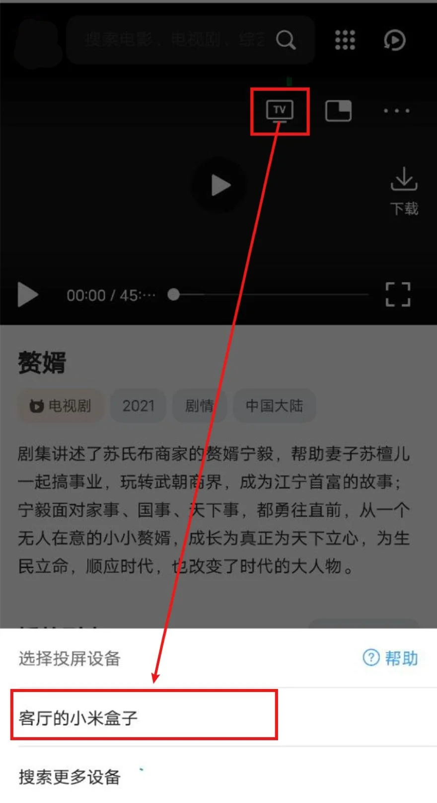 打开QQ浏览器(会接管网页播放器)->打开雪儿视频->播放视频->选中投屏图标->等待搜寻出智能电视/电视盒子->选中,即可投屏。